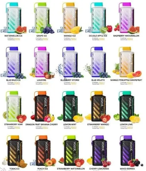 | Flavor | Watermelon Ice, Grape Ice, Mango Ice, Double Apple Ice, Raspberry Watermelon, Blue Razz Ice, Lavafris, Blueberry Storm, Blue Mojito, Mango Pineapple Grapefruit, Strawberry Kiwi, Dragon Fruit Banana Cherry, Lemon Mint, Strawberry Mango, Lemon Lime, Tobacco, Peach Ice, Strawberry Watermelon, Cherry Lemonade, Mixed Berries |